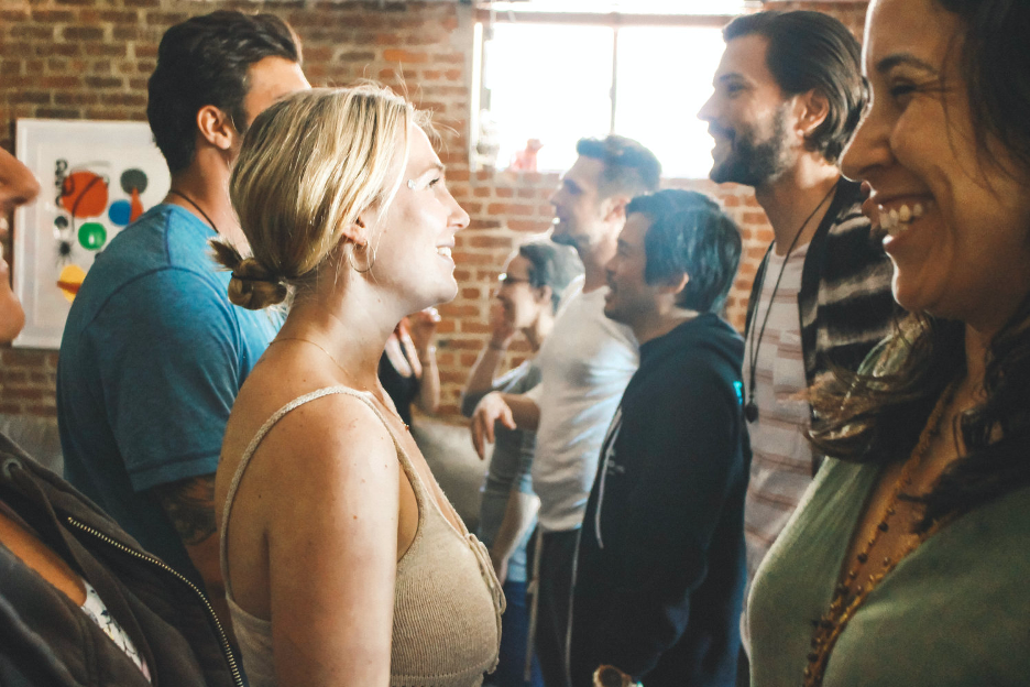 The in-person Vulnerable AF experience is so human. I create time for people to network and connect. I facilitate that by giving people questions to ask one another. We do a lot of partner and group exercises that promote closeness—some involve touch, eye gazing, or dancing with one other. I help people get out of their comfort zones and get comfortable with each other.